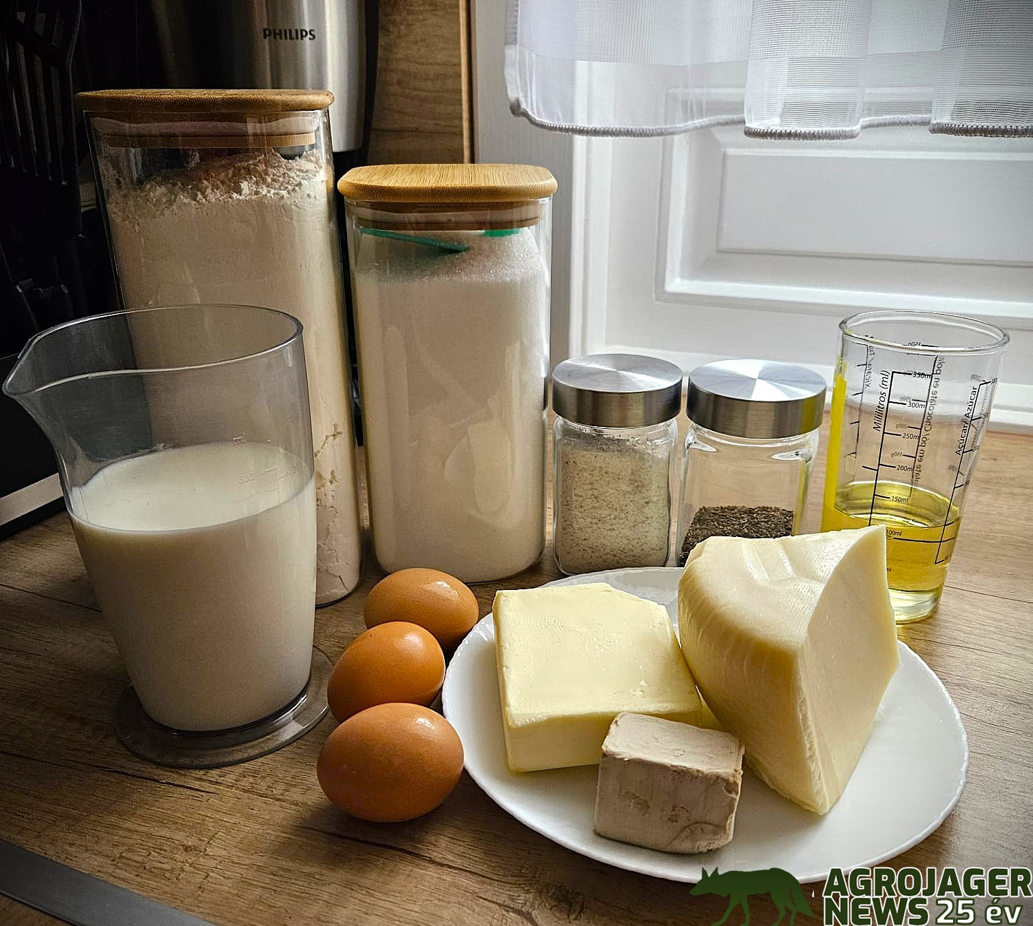 Először is gyúrjuk össze a tésztát. Meglangyosítjuk a tejet, beletesszük a cukrot és az élesztőt, így hamarabb kel a tészta. Mikor ezzel megvagyunk, a zsírt beledörzsöljük a lisztbe, hozzáadjuk az élesztős tejet és kellemes lágy tésztát gyúrunk. A vajat kikavarjuk a három tojássárgájával és egy csapott evőkanál sóval. Alapesetben csak ezt sózzuk, de ha vadászatra készítem, akkor egy pici sót teszek a tésztába is, hogy ha esetleg koccintanak, akkor fogyjon mellé a sós is és a meccs nézésnél is jobban fogy!