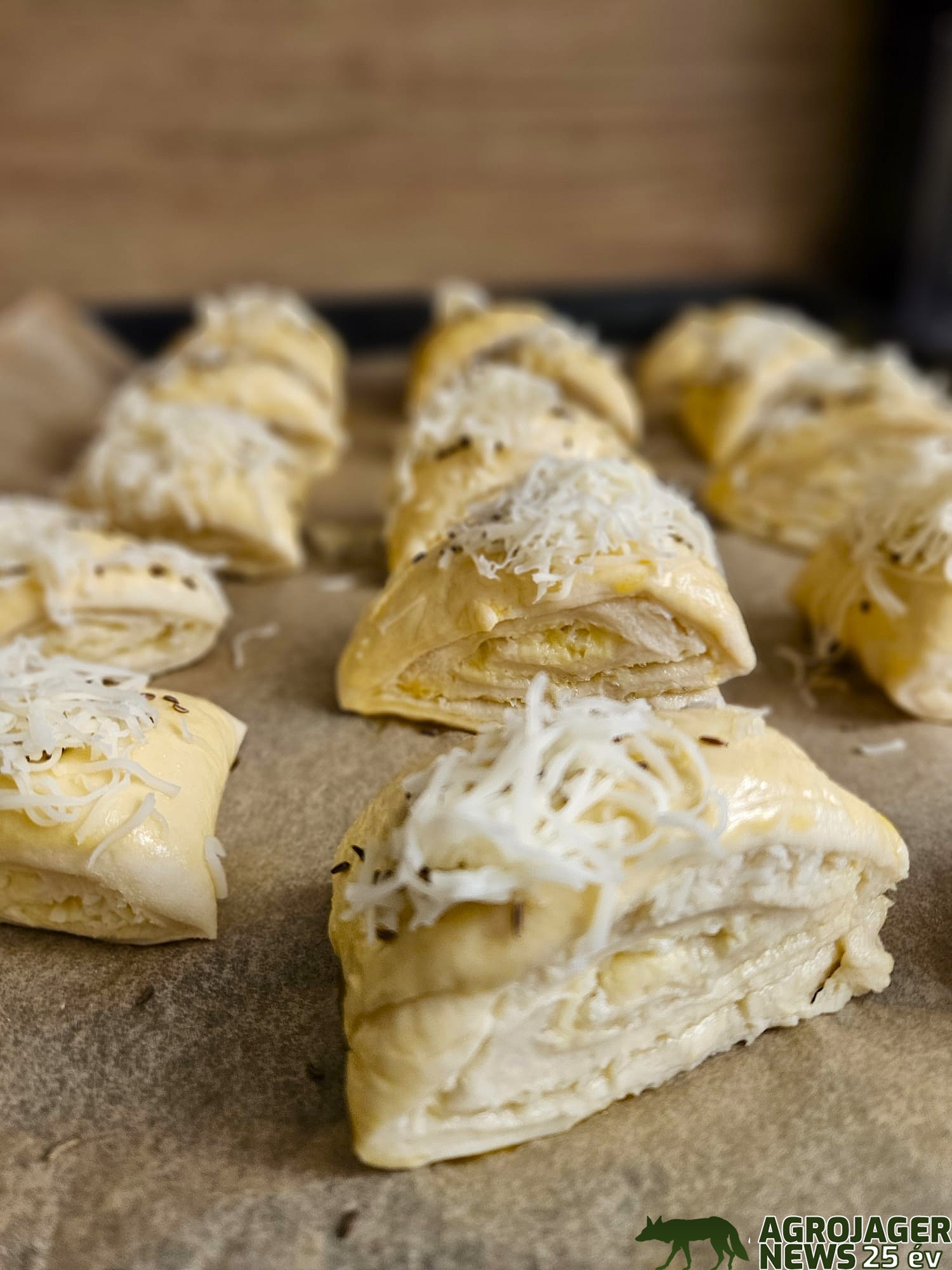 A tésztát tehát nyújtsuk ki, kenjük meg a tojással kikevert vajjal, szórjunk rá sajtot és tekerjük fel. Utána szeleteljük fel úgy, hogy, ha felülről nézzük, akkor háromszögeket kapjunk és már mehet is a sütőpapírral bélelt tepsire: szépen sorban.