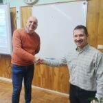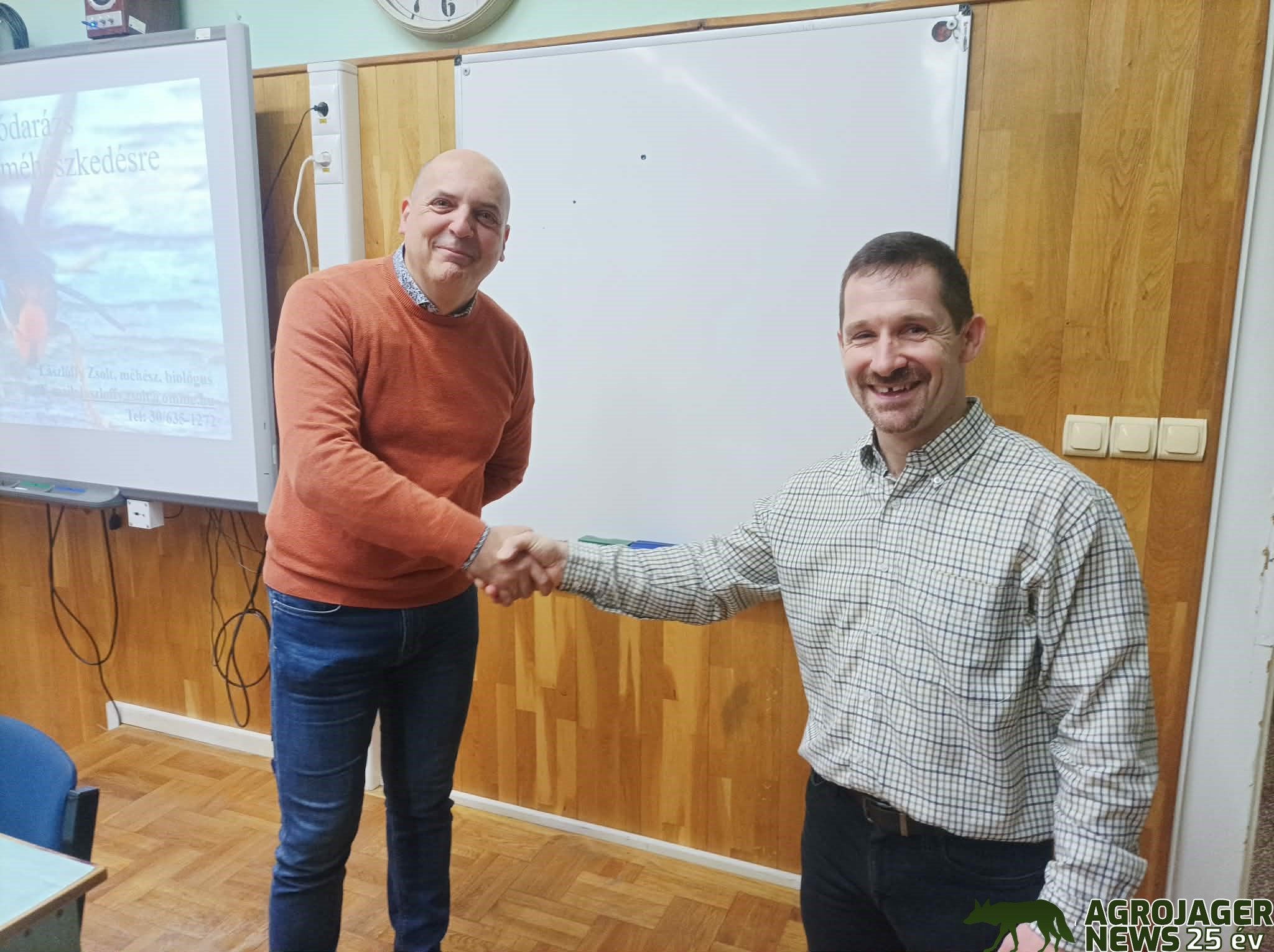Svéda Gergely, az Alföldi ASzC Kiss Ferenc Erdészeti Technikum szakmai igazgatóhelyettese köszönti Lászlóffy Zsolt előadót az Erdők Hete programsorozat keretében. Fotó: Agro Jager News
