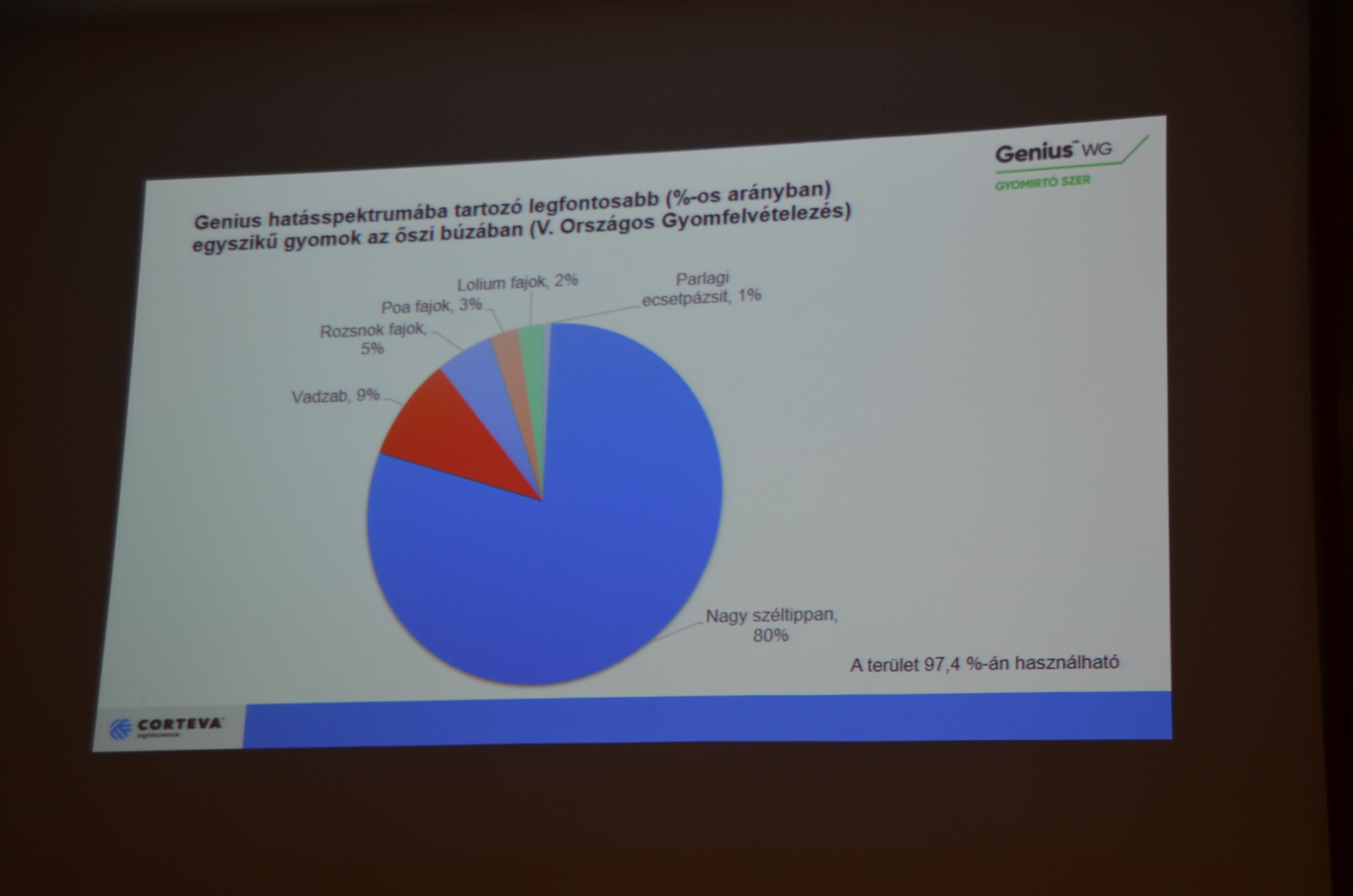 Mindannyian jól ismerjük a Corteva termékpalettáját. A Mustang Forte a kalászosokban segít nekünk az évelő gyomnövények, különösen a mezei acatot megfékezésében, de érdemes megemlíteni a meleg és hosszú őszök miatt a Bizont, amellyel az úgynevezett őszi szőnyeggyomokat tudjuk kikapcsolni és valójában nagyon sok nitrogént tudunk ezzel a lépéssel megspórolni. Tavaszi párja a Genius, amellyel pedig a rozsnok fajokat, a vadzabot fékezhetjük meg. A Corteva termékei között megtalálható a Colombus, amellyel a gabonában a zászlóslevél megjelenéséig védekezhetünk – például egy csapadékos tavasz esetén, amikor már-már uralhatatlanná válna gabonatáblánk. Kérdésekkel érdemes növényorvosainknál további tájékoztatást kérni.