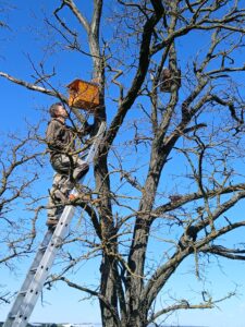 A vörös vércséknél pedig hátha lesz egy kései költés. Mert egyelőre a polgári vércsetelepen csak egy vörös vércse tojó árválkodik a ládában. Bár még bőven van ideje, hogy „bepasizzon”. Jobbra vörös vércsék költenek, középen az új láda a kékvércséknek, bal szélen Csaba barátom.