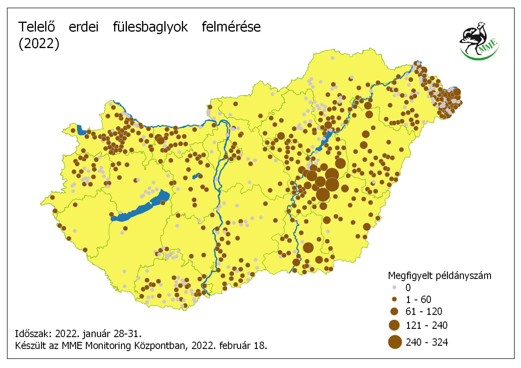 Az MME idén is a lakosság és a média segítségét kérte a Magyarországon telelő erdei fülesbagoly csapatok országos felméréséhez január végén. A most elkészült összesítés alapján az összefogás ismét sikeres volt. A minden eddiginél több beérkező adat alapján tudjuk, hogy hazánk legalább 699 településén, 1 104 helyszínen, 11 040 erdei fülesbagoly telelt – közölte a Magyar Madártani Egyesület.