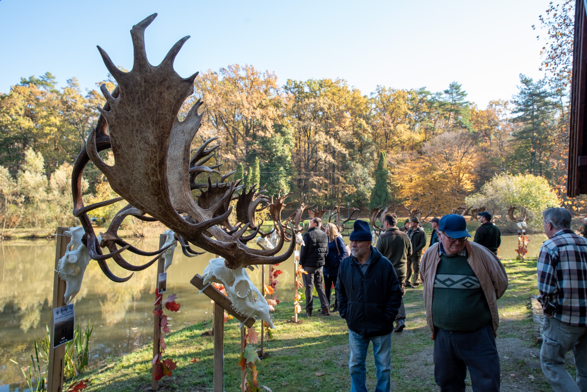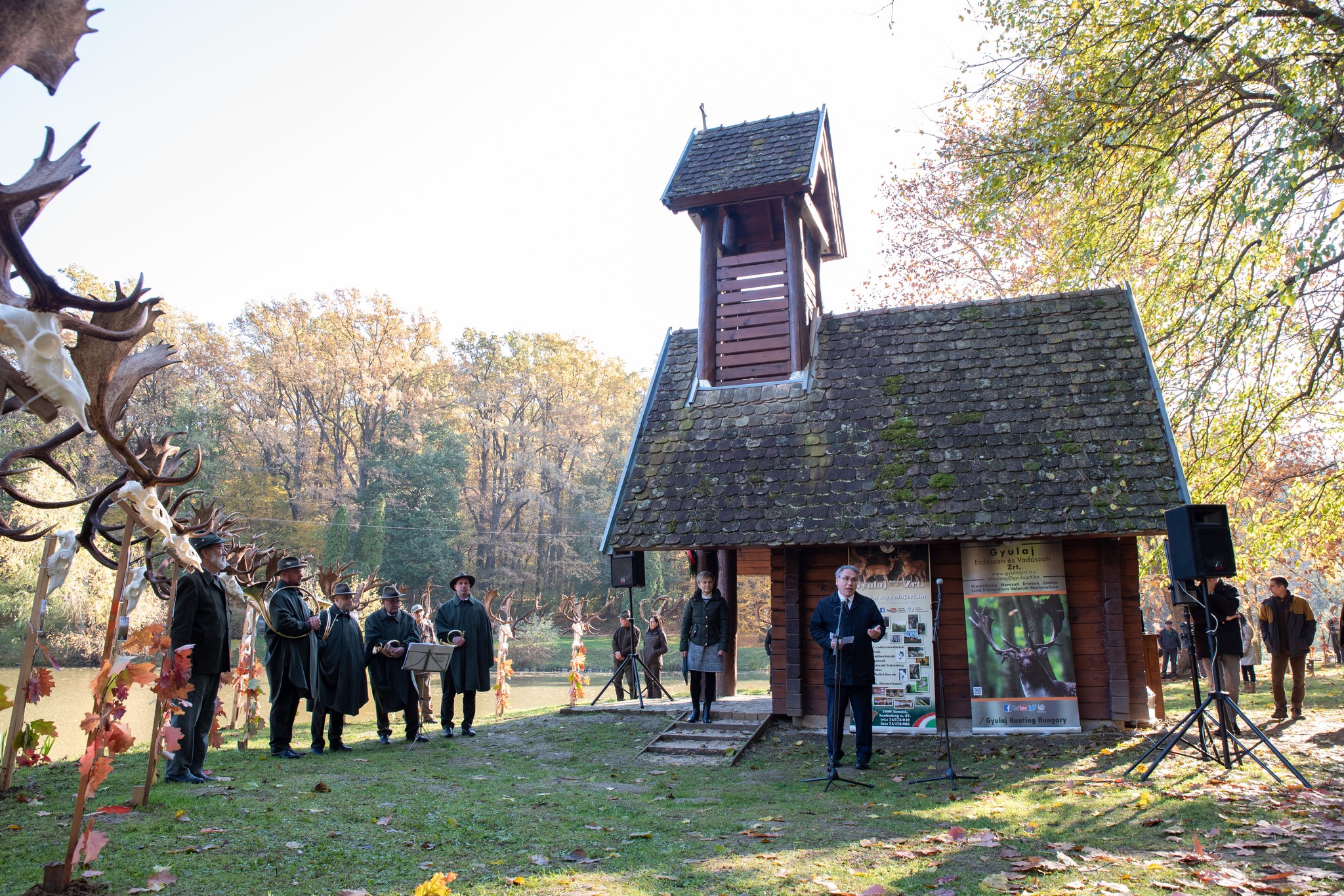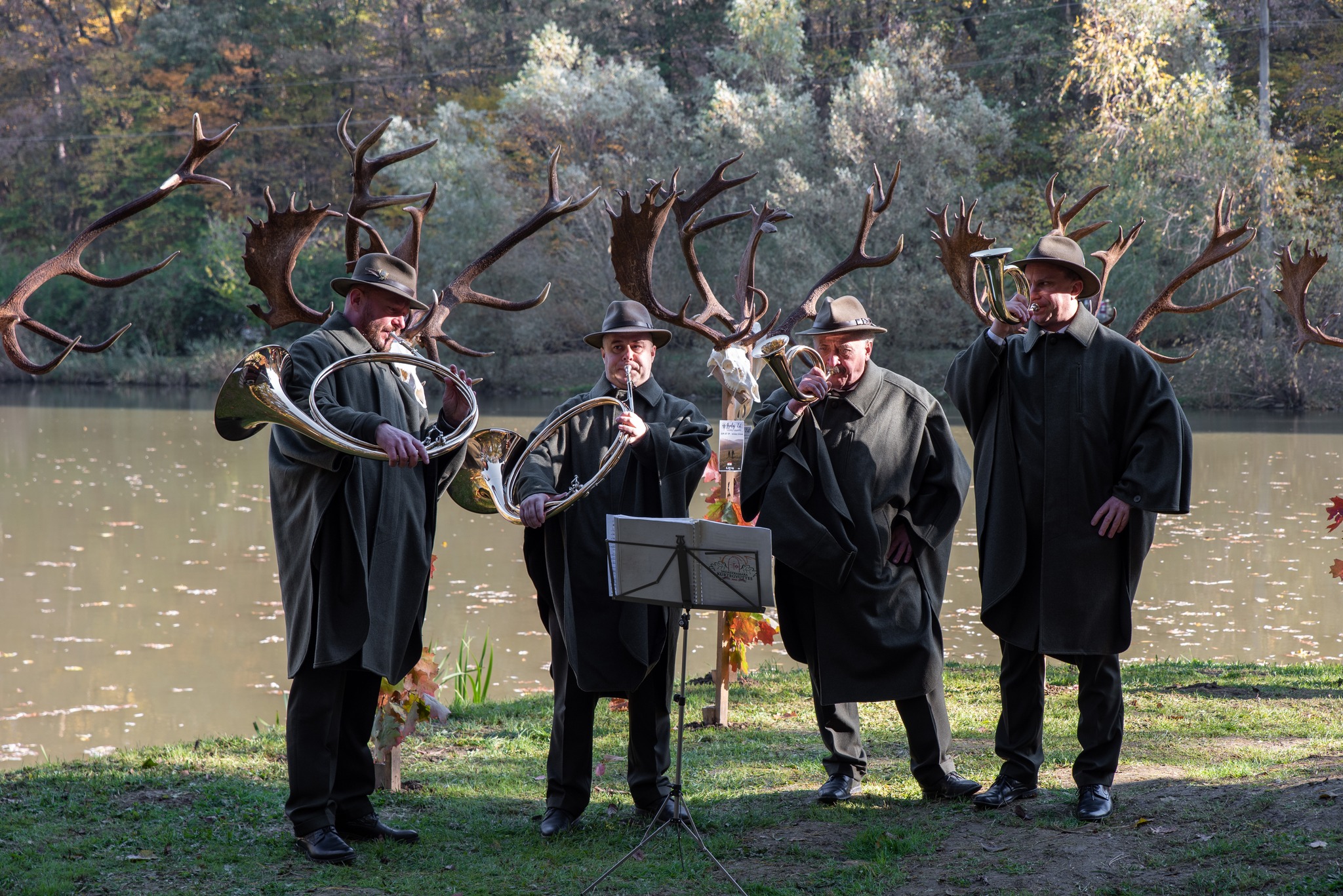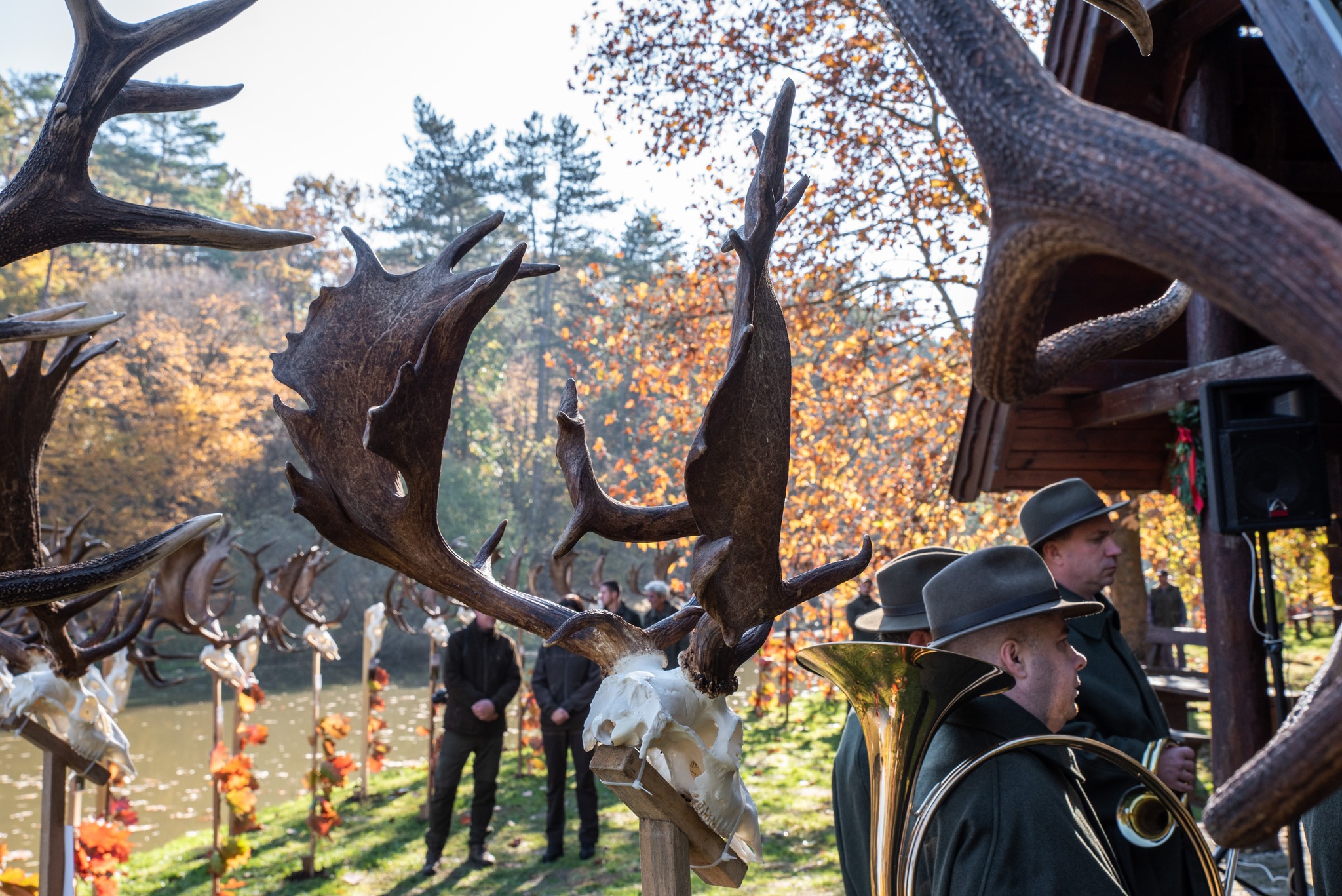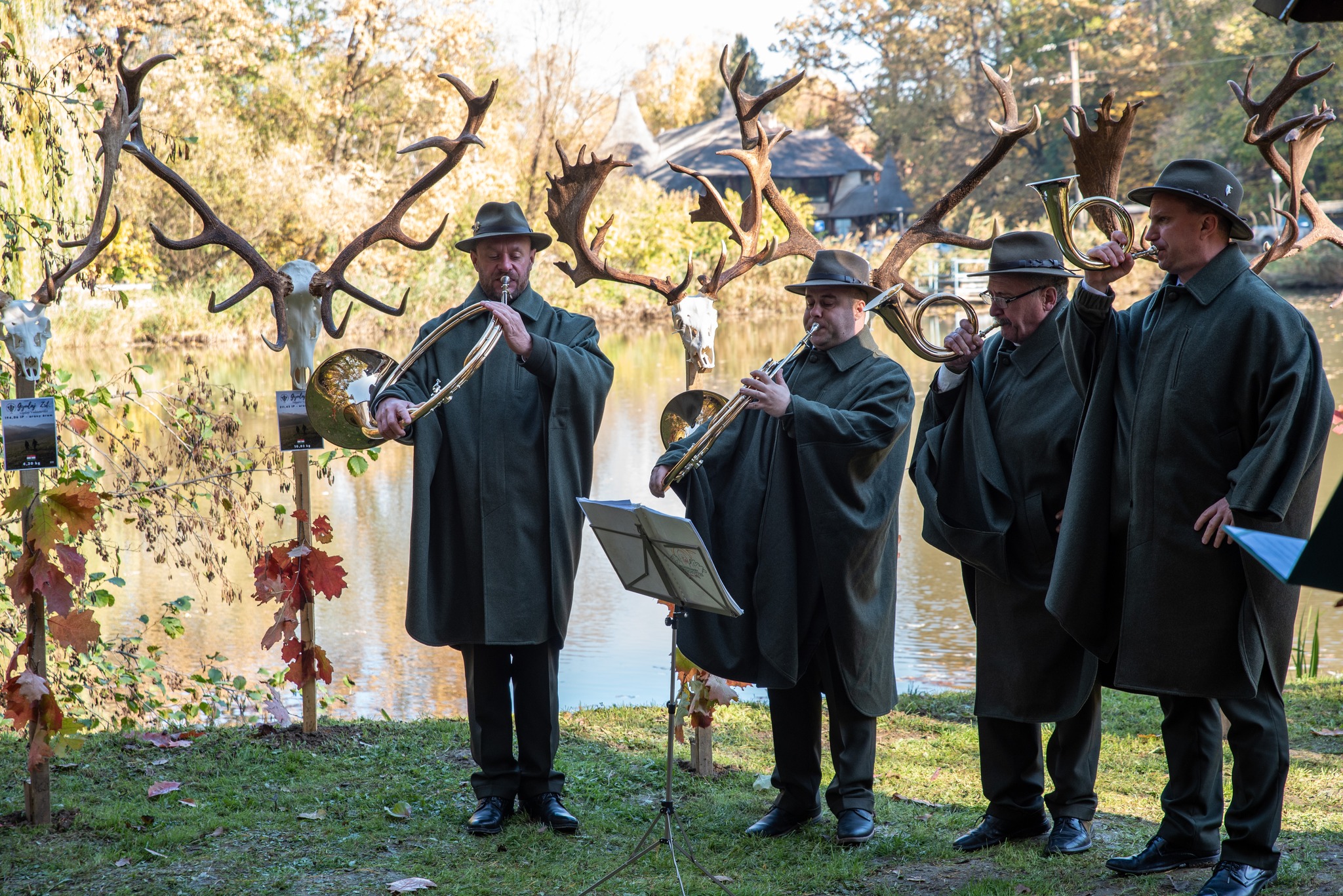 A Vadászkamara Kürtegyüttese gyönyörű szólamaival kezdődött a trófeaszemle a tó és az erdő semmivel fel nem érő kiváló akusztikájában, mindez a természet őszi pazar lombszíneződése mellett.
