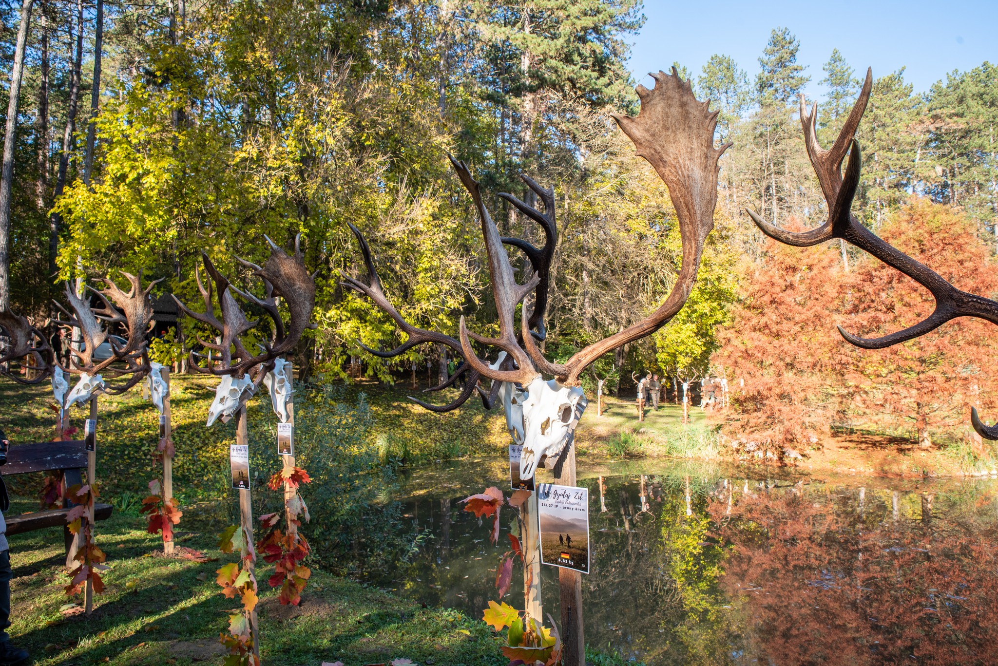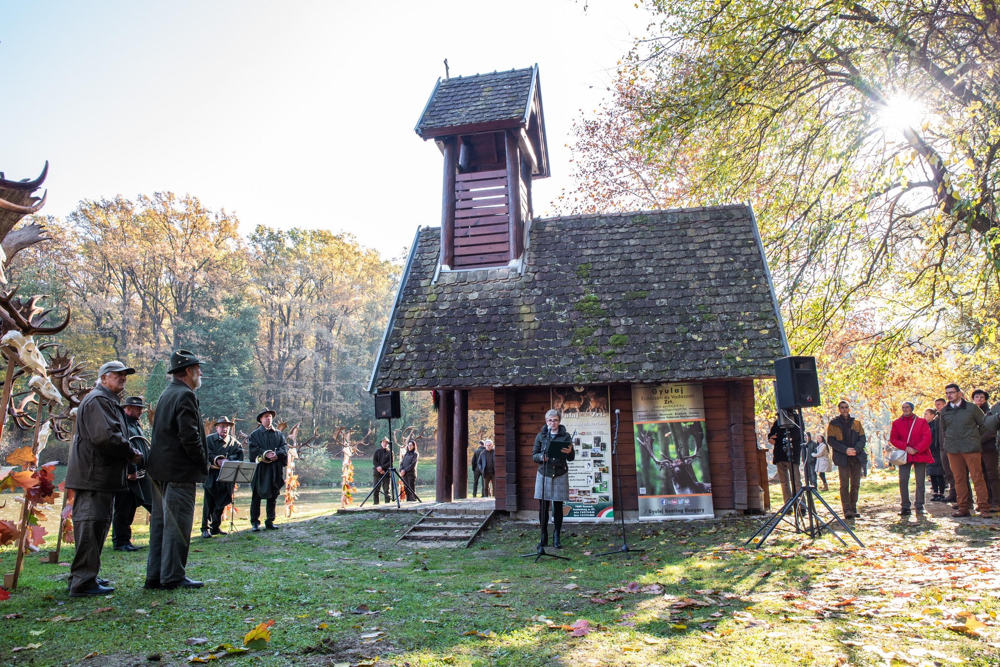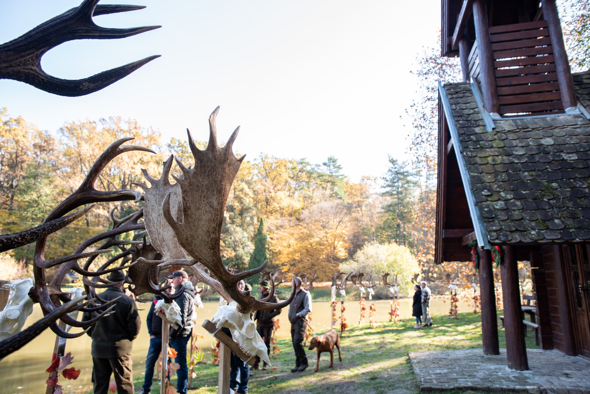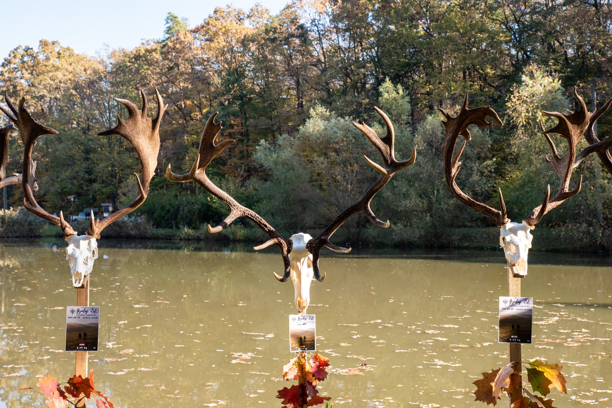 A Vadászkamara Kürtegyüttese gyönyörű szólamaival kezdődött a trófeaszemle a tó és az erdő semmivel fel nem érő kiváló akusztikájában, mindez a természet őszi pazar lombszíneződése mellett.