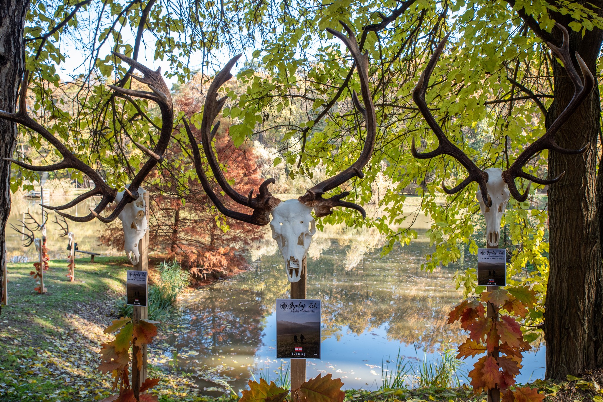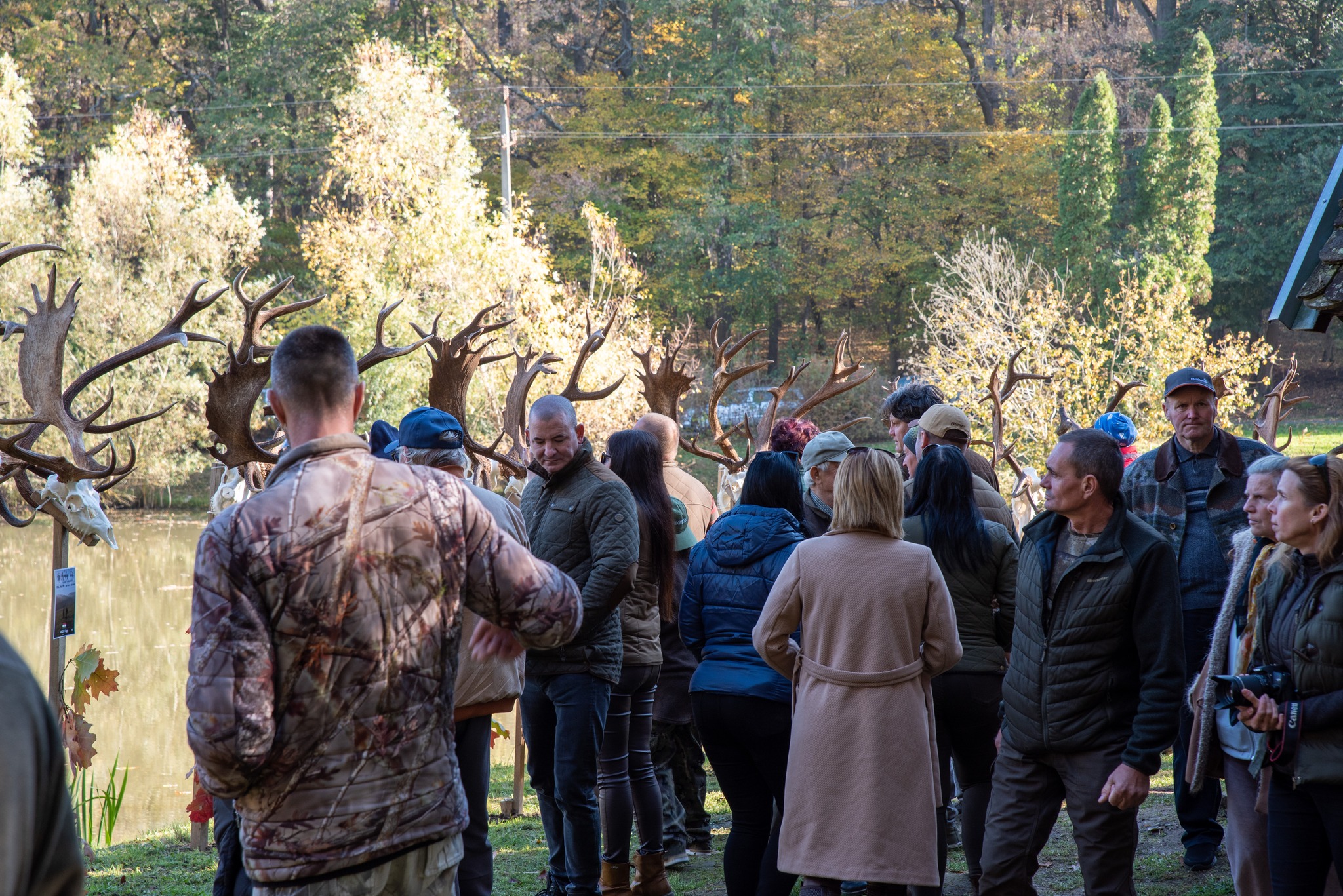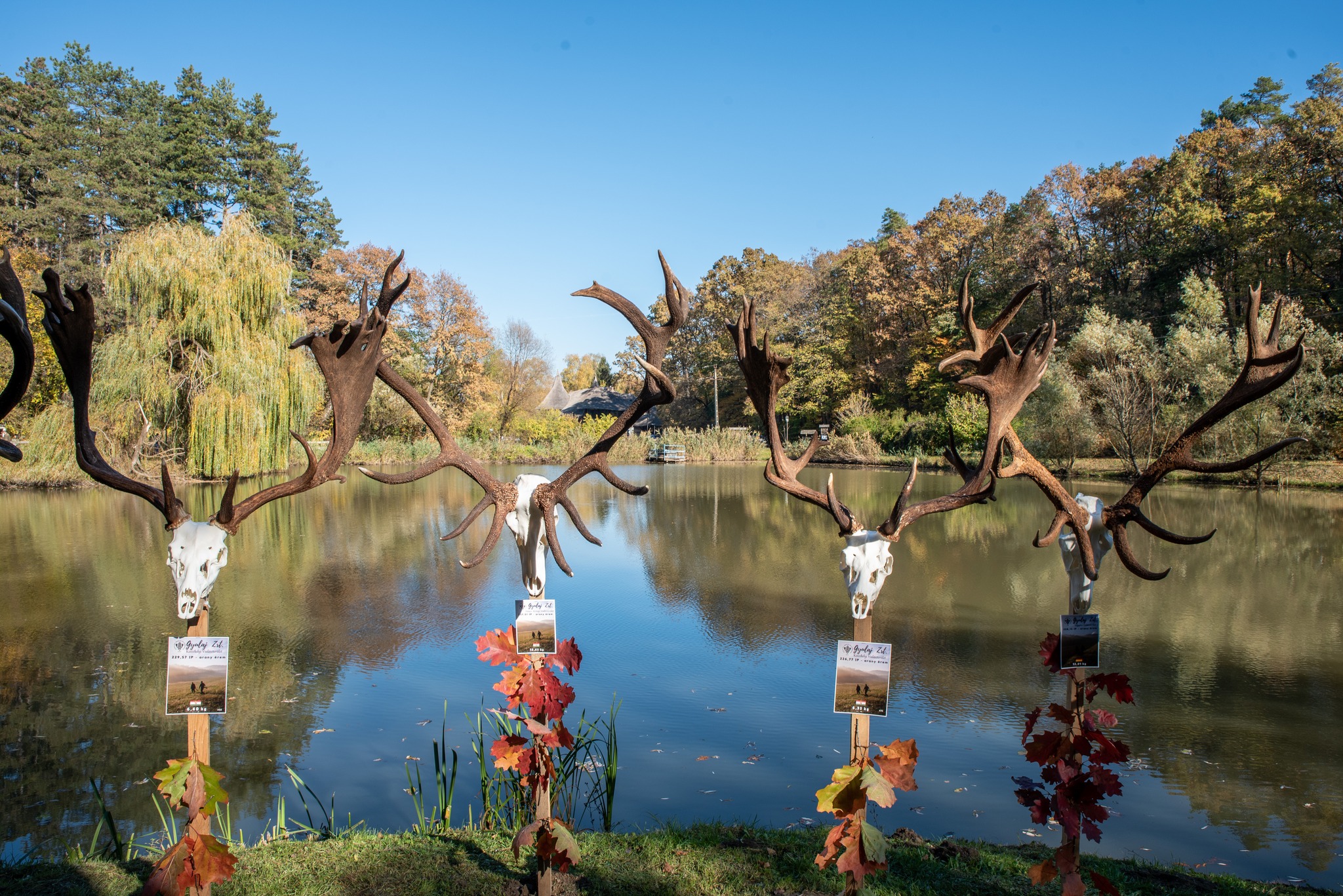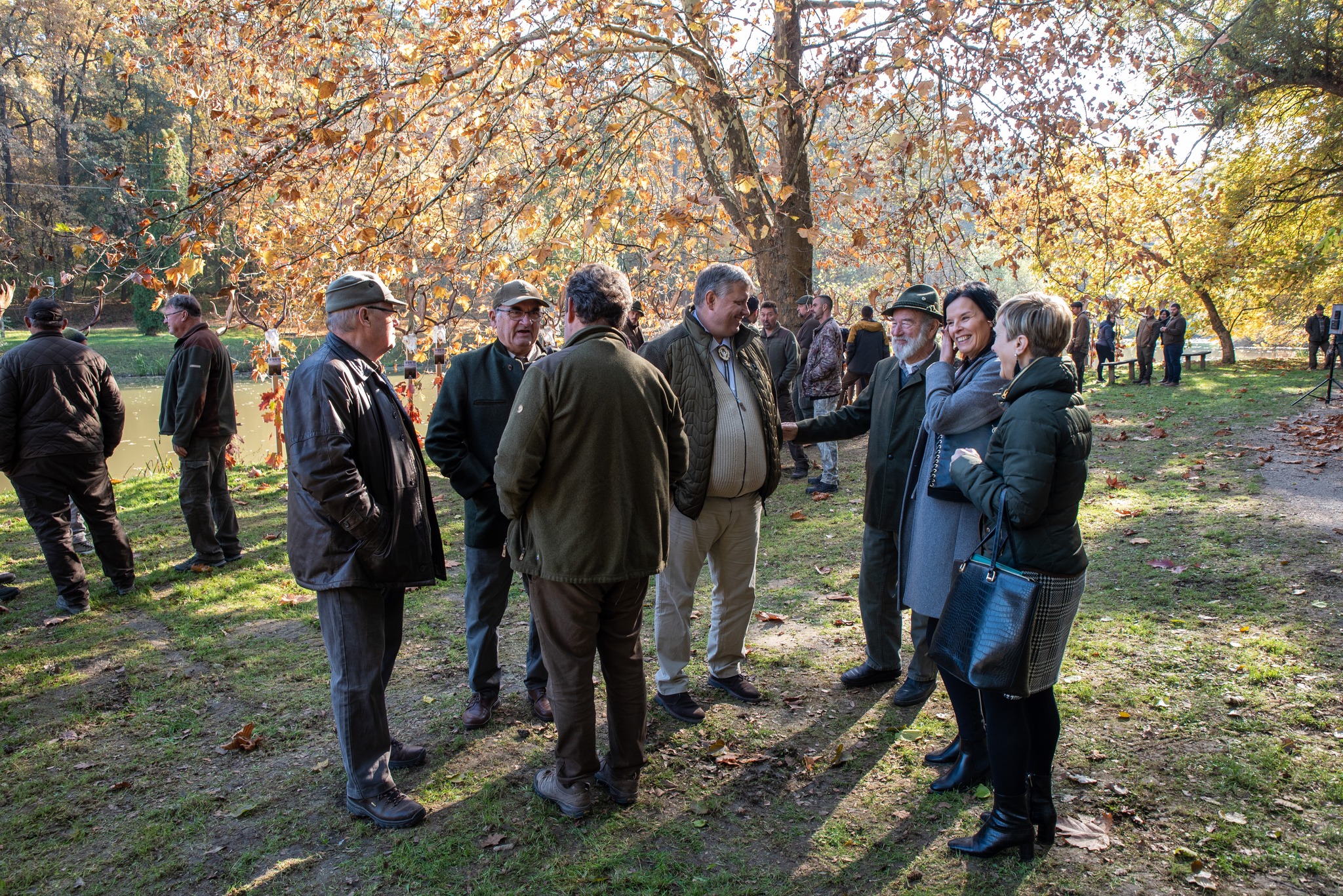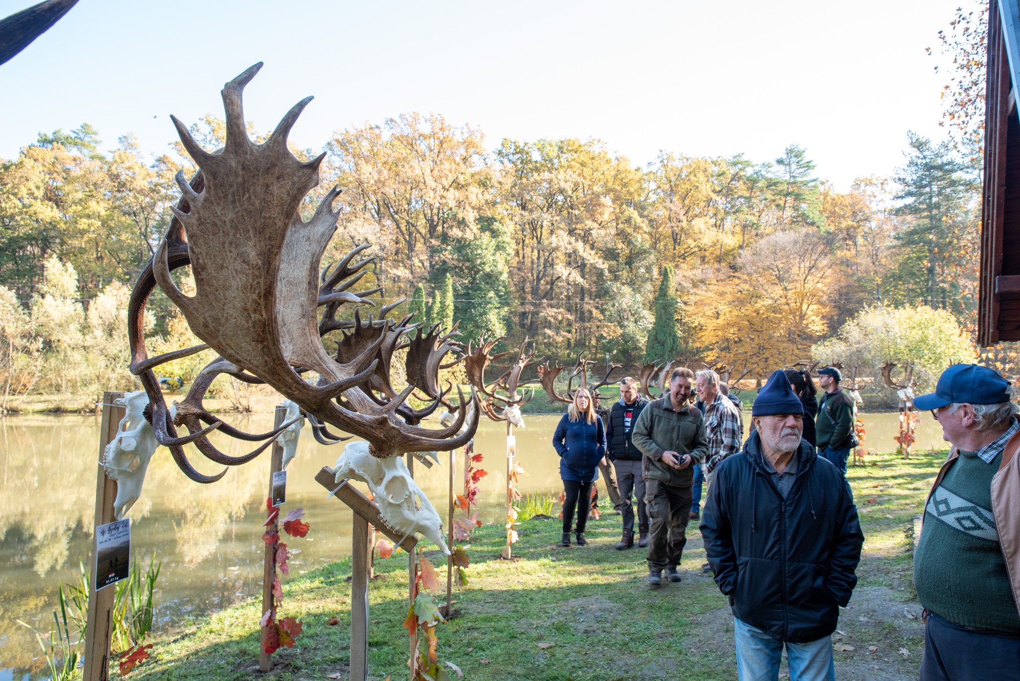 A Vadászkamara Kürtegyüttese gyönyörű szólamaival kezdődött a trófeaszemle a tó és az erdő semmivel fel nem érő kiváló akusztikájában, mindez a természet őszi pazar lombszíneződése mellett.