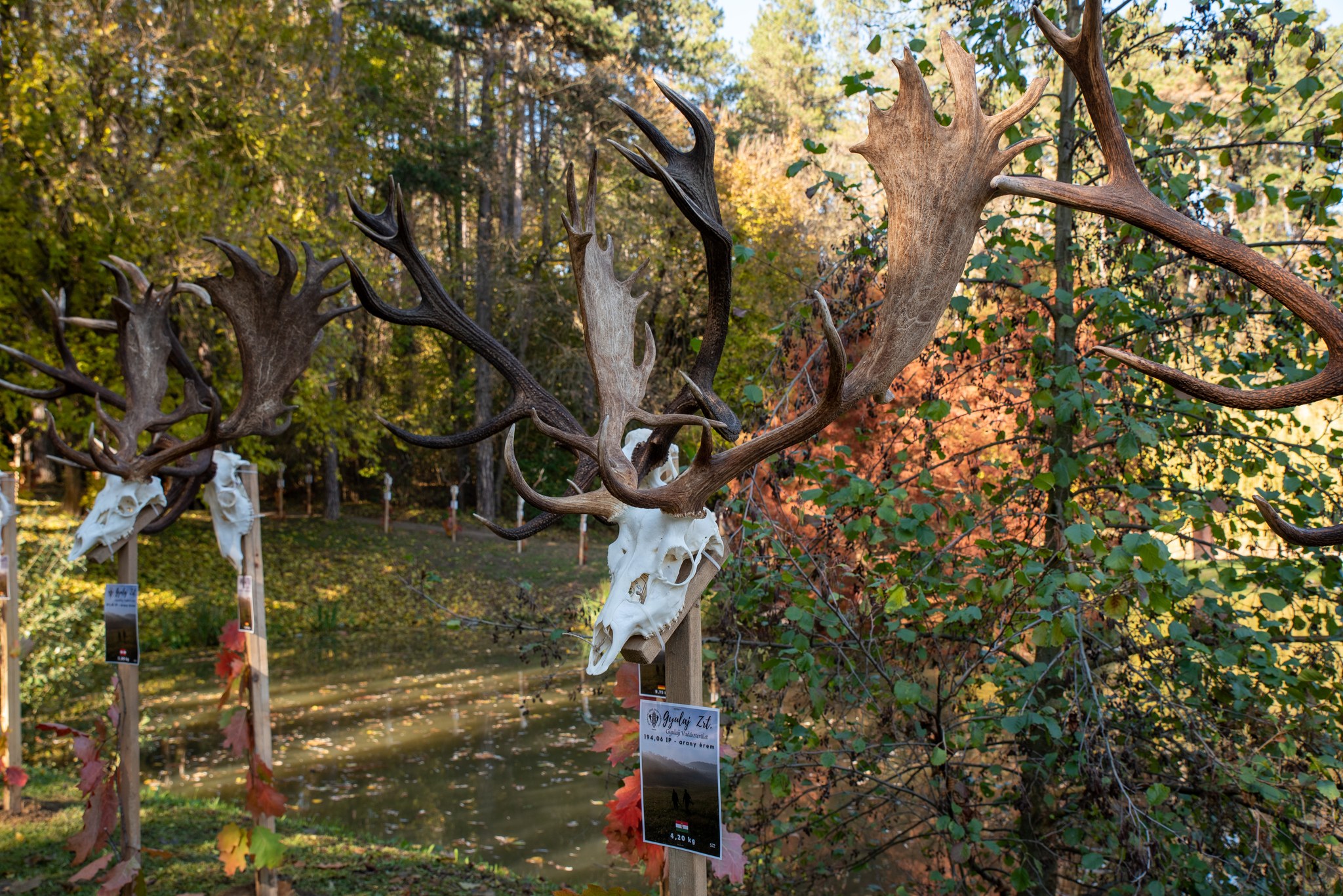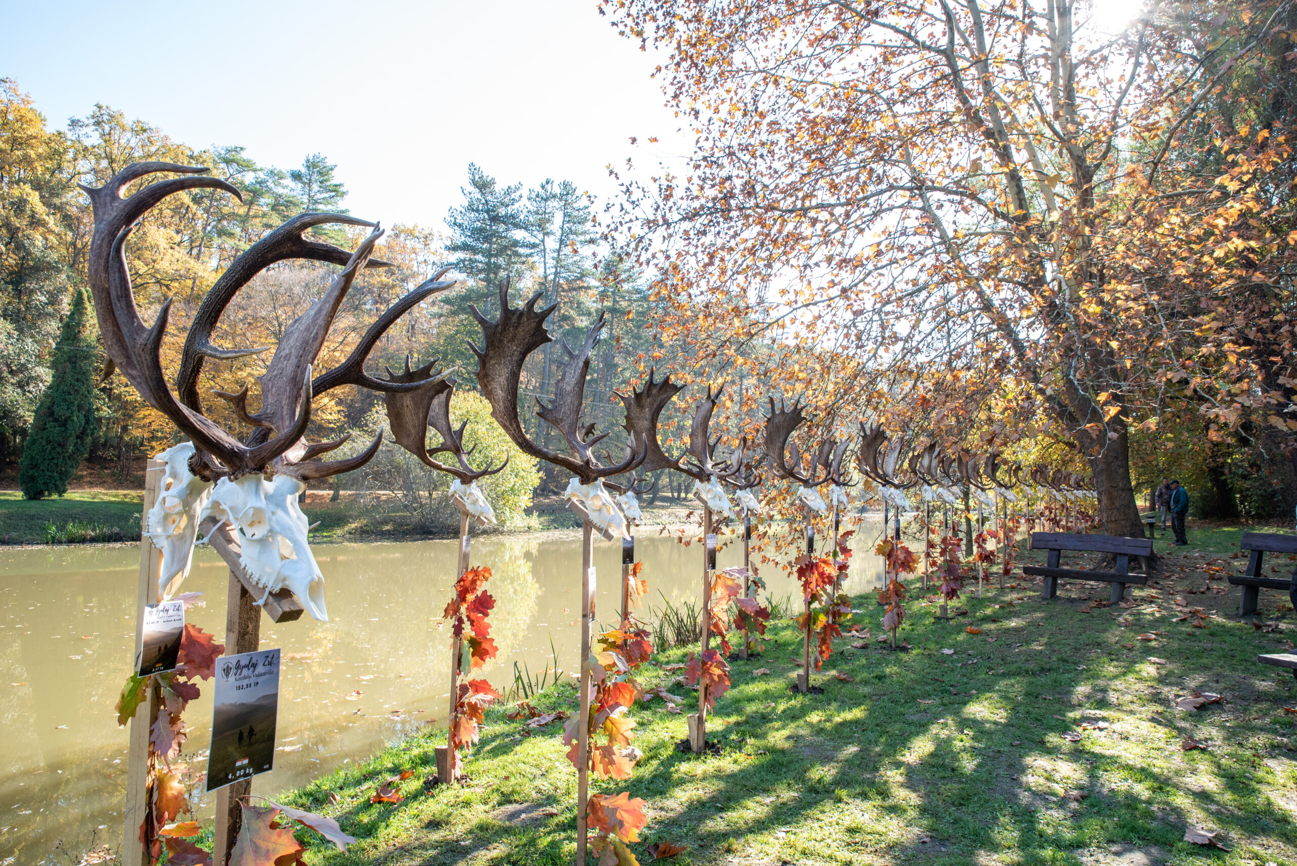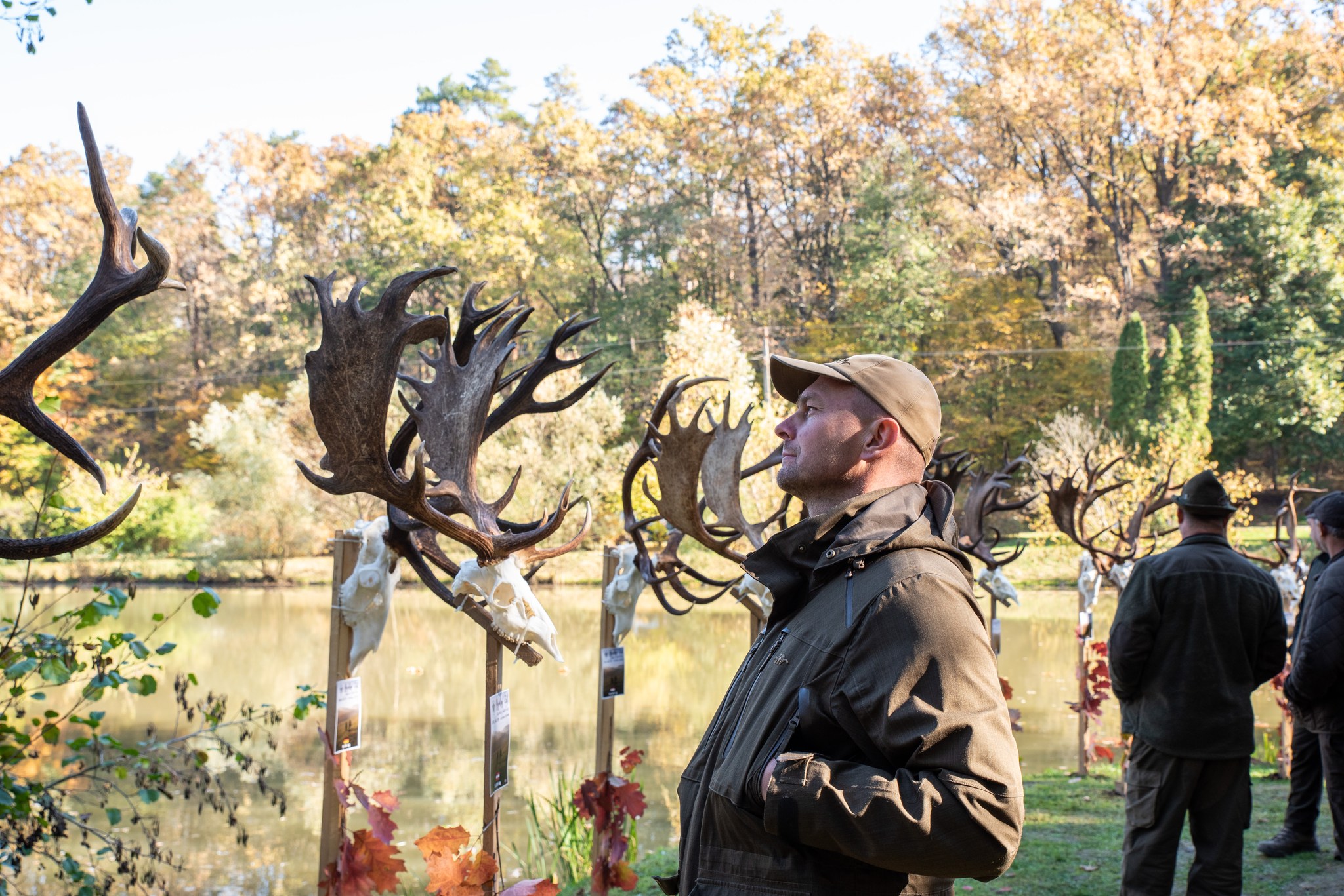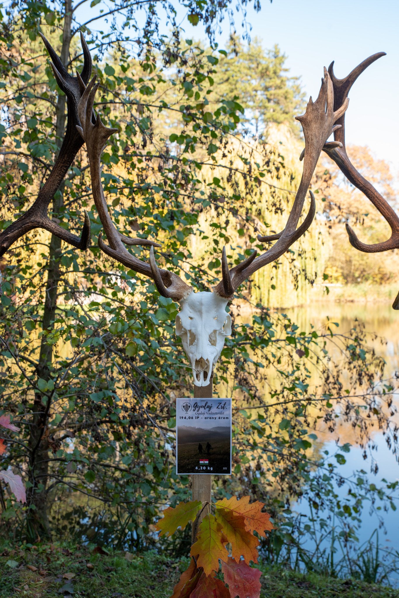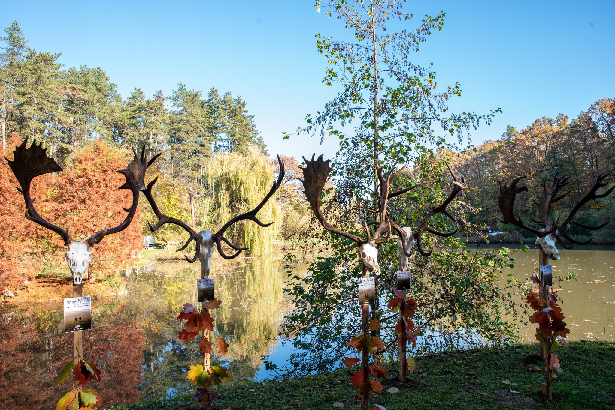 A Vadászkamara Kürtegyüttese gyönyörű szólamaival kezdődött a trófeaszemle a tó és az erdő semmivel fel nem érő kiváló akusztikájában, mindez a természet őszi pazar lombszíneződése mellett.